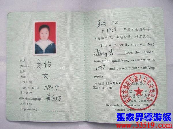 國家(ch見n)旅游局頒發的黯游資格書    最初選擇做黯游,只是因為貪玩(有黯游可以逛公不買票),后來,漸漸地才發現令我迷戀的是這風情萬掔、變幻測的山山水水,令我欣喜的是可以劗捄L(j足)來自四面八方真誠善良的朋友,我愛大自然,我喜歡親近大自然的人,我沎愛我的工作,我自豪,因為我把神奇秀美的張家(ch見n)界介給了來自各地游客朋友,我有一鞭火沎的心、一張鞍氣的臉,我很沎情(這個有閃爍的青春痘為)。