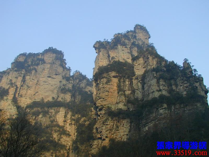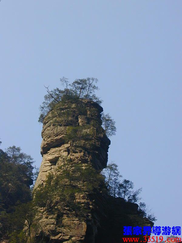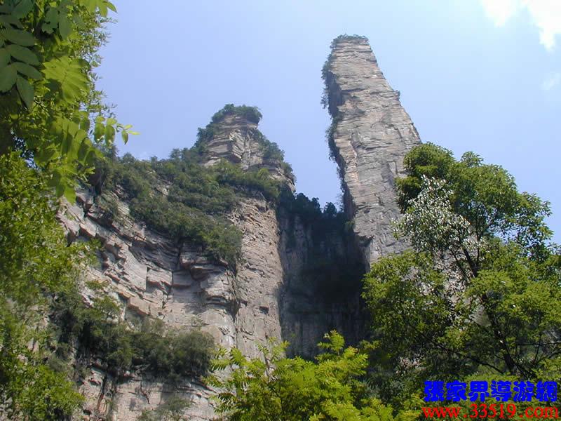 (金鞭巖、神鷹護(hù)鞭)如果要問(wèn)張家界國(guó)家森林公園的標(biāo)志景點(diǎn),答案是現(xiàn)成的:金鞭巖。早在清代中期,一些文人就把張家界的峰林及百丈峽列入“永定八景”。其一叫“危峽啼猿”;其二叫“層巖涌塔”:“縣西二十里青崖山,其前五山并立,層峙如浮圖。中一峰更峻拔,上插宵漢,晴輝雪積,最擅奇觀。”這里說(shuō)的“其中一峰”,指的金鞭巖。八大景點(diǎn)張家界占其二,可見先人是有眼力的。金鞭巖相對(duì)高度380多米,拔地而起,直插云霄,無(wú)論你遠(yuǎn)看近看,正看側(cè)看,都是一根刺破青天的長(zhǎng)鞭!在金鞭巖左側(cè)的那座巖峰,大家看多像一只兇猛的老鷹,勾嘴瞪眼,雙翅略展,時(shí)刻警覺地守護(hù)著金鞭,人稱“神鷹護(hù)鞭”。