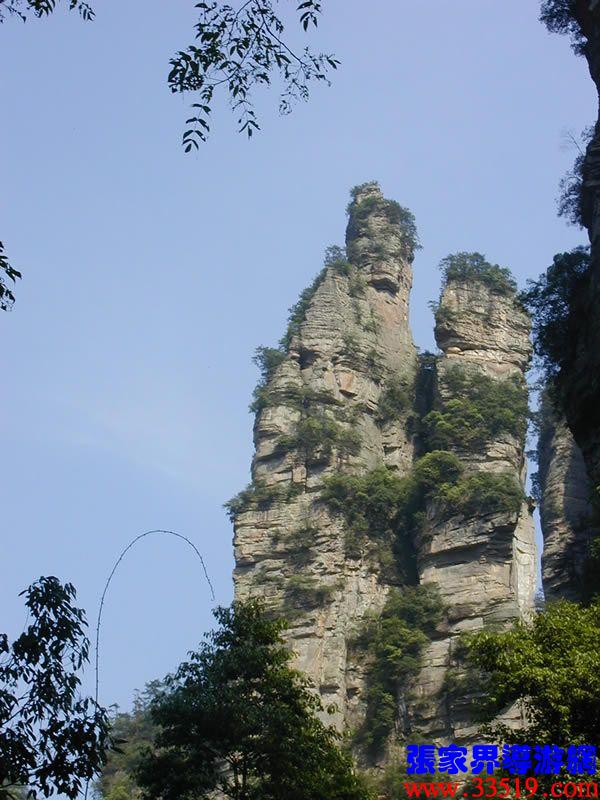 (花果山、水簾孫悟空的花果山水簾到了。并不是張家界人過(guò)于牽強(qiáng),胡亂把西游記的事兒往這兒湊,實(shí)在是巧合,《西游記》劇組的導(dǎo)游楊潔及唐僧、豬八戒、孫猴子、沙和尚等飾演者,一見到這地方就十分肯定地說(shuō):外景地選遍全國(guó),只有張家界才真正是《西游記》筆下的神仙妖魔世界。大家順著我的指向往前看,左前方是帶著僧帽,披著袈裟,嘴中念念有詞的唐僧,緊跟在他后面的那座黑乎乎的石峰當(dāng)然就是沙和尚了;神通廣大的孫猴子半蹲在唐僧后側(cè)手搭涼篷,正在觀察敵情呢;豬八戒哪去了?不用說(shuō),不是貪吃貪睡,就是偷偷找小女子搭訕去了,花心去了。