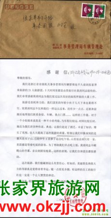 浙江省省級機關事務管理局車輛管理處致張家界康泰國旅導游黃濤感謝信
