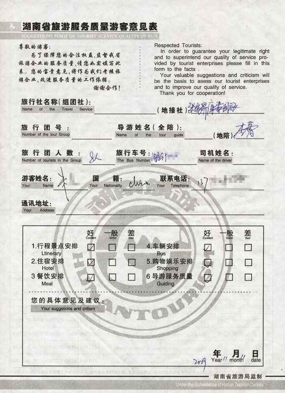 2009年11月11日朱先生一行8人旅游接待質量反饋單: