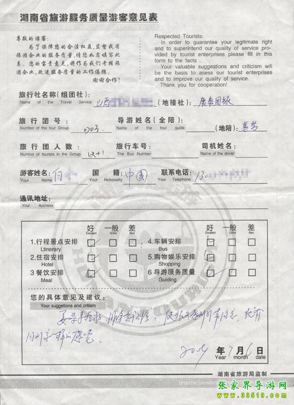 2009年7月6日山西白女士一行12人接待質(zhì)量反饋單: