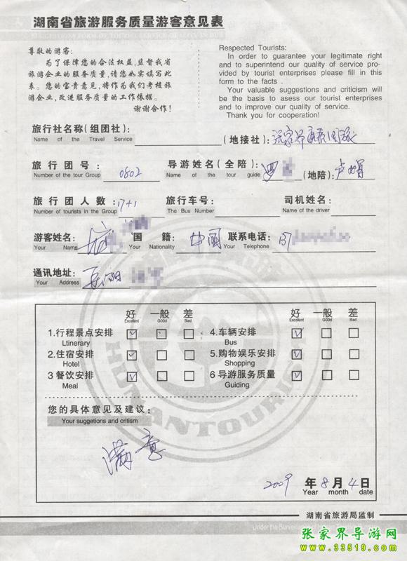 2009年8月2日岳陽(yáng)龍先生一行18人接待質(zhì)量反饋單: