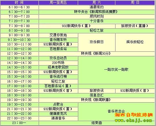 張家界旅游交通頻道茲定于四月八號試播,頻率為FM93.2兆赫和103.2兆赫。頻道以立足旅游交通、服務(wù)百姓大眾為宗旨,設(shè)置了《清晨有約》、《順風時刻》、《932新聞快報》、《輕松之旅》、《交通你我他》、《百姓服務(wù)站》、《歡樂總動員》和《音樂隨車聽》等欄目。屆時,聽眾可以通過熱線電話、短信平臺以及網(wǎng)絡(luò)廣播等多種途徑參與到電臺節(jié)目中來,在第一時間了解新聞動態(tài),掌握市場信息,享受娛樂休閑。